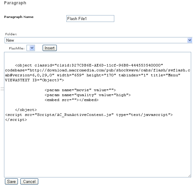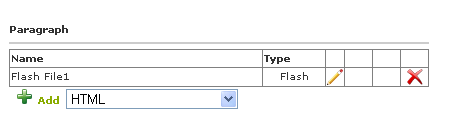 To add the Flash content to your paragraph, Select 'Flash' option in the paragraph drop down list and click on the "Add" link. It will open up a new page like this.