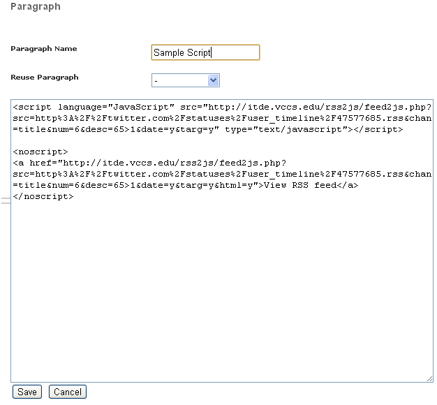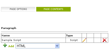 To add the Script to your paragraph, Select 'Script' option in the paragraph drop down list and click on the "Add" link. It will open up a new page like this.